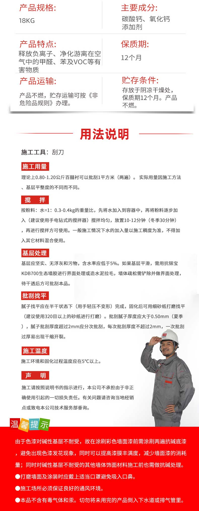 適用于室內(nèi)混凝土、砂漿墻面基層批刮找平。質(zhì)感細(xì)膩、耐水強(qiáng)度高、不易粉化、干縮強(qiáng)度底、抗裂性好、施工性能優(yōu)異、在不同水質(zhì)情況下能保持優(yōu)良的和易性。本品除具有傳統(tǒng)膩?zhàn)友b飾功能外,還具有獨(dú)到的環(huán)保、保健功能,全方位捕捉并凈化游離在空氣中的甲醛、苯及TVOC等有害物質(zhì),有效地凈化屋內(nèi)空氣,還我們一個(gè)清新的居室環(huán)境。