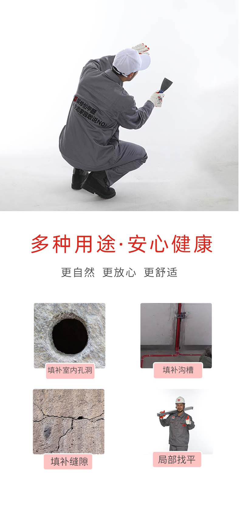 本品是一種以石膏為主要原料和多種添加劑混合而成的墻面修補材料。粘結強度高、收縮性小、和易性好、施工性能優異。適用于修補室內孔洞、溝槽、縫隙和局部找平。初凝時間為30分鐘,固化過程60-90分鐘。