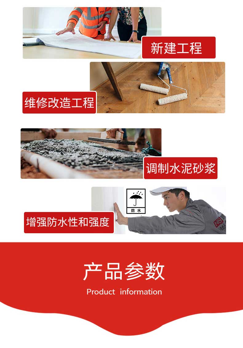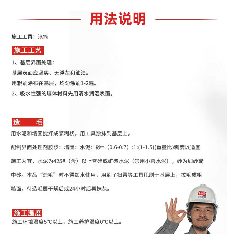 本品采用科學配方研制而成,是一種高分子水泥體系,具有很強的滲透性,能充分浸潤基層表面,提高新抹砂漿與基層材料的吸附力,增加粘結性能,避免水泥砂漿與光滑墻面粘結時空鼓,對不易抹灰的墻體材料如聚苯板 泰折板 瀝青涂層 聚氨酯防水層 鋼板 加氣磚 粘土珍珠巖以及現澆混凝土均能提高其結合力,適用各種新建工程、維修改造工程、及調制水泥砂漿,以增強其防水性及強度。