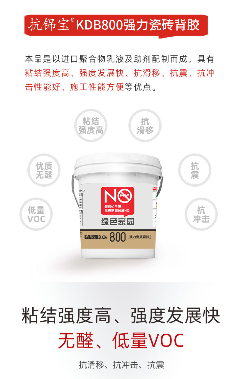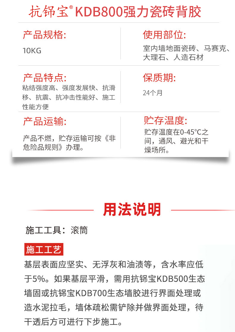 基層表面應(yīng)堅(jiān)實(shí)、無(wú)浮灰和油漬等。含水率應(yīng)低于5%。如果基層平滑,需用KDB500生態(tài)墻固或KDB700生態(tài)墻膠進(jìn)行界面處理或造水泥拉毛;墻體疏松需鏟除并做界面處理。待干透后方可進(jìn)行下步施工。施工要求:用毛刷或滾桶把該產(chǎn)品滾涂在瓷磚、馬賽克、大理石、人造石材的背面,變?yōu)橥该鳡詈竽ㄉ纤噤佡N即可;絕不會(huì)有空鼓、脫落現(xiàn)象,安全簡(jiǎn)易,是常規(guī)界面劑的最佳替代品;室外雨天禁止施工。