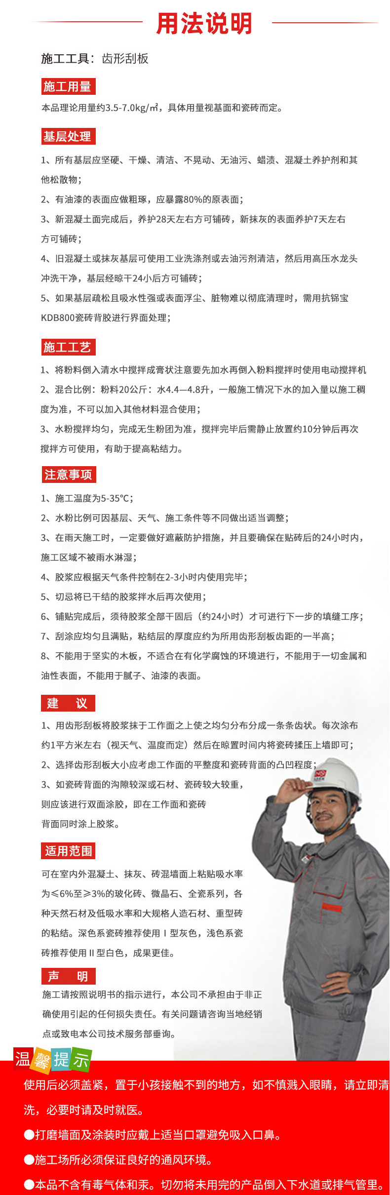 本品理論用量約3.5-7.0kg/㎡,具體用量視基面和瓷磚而定。