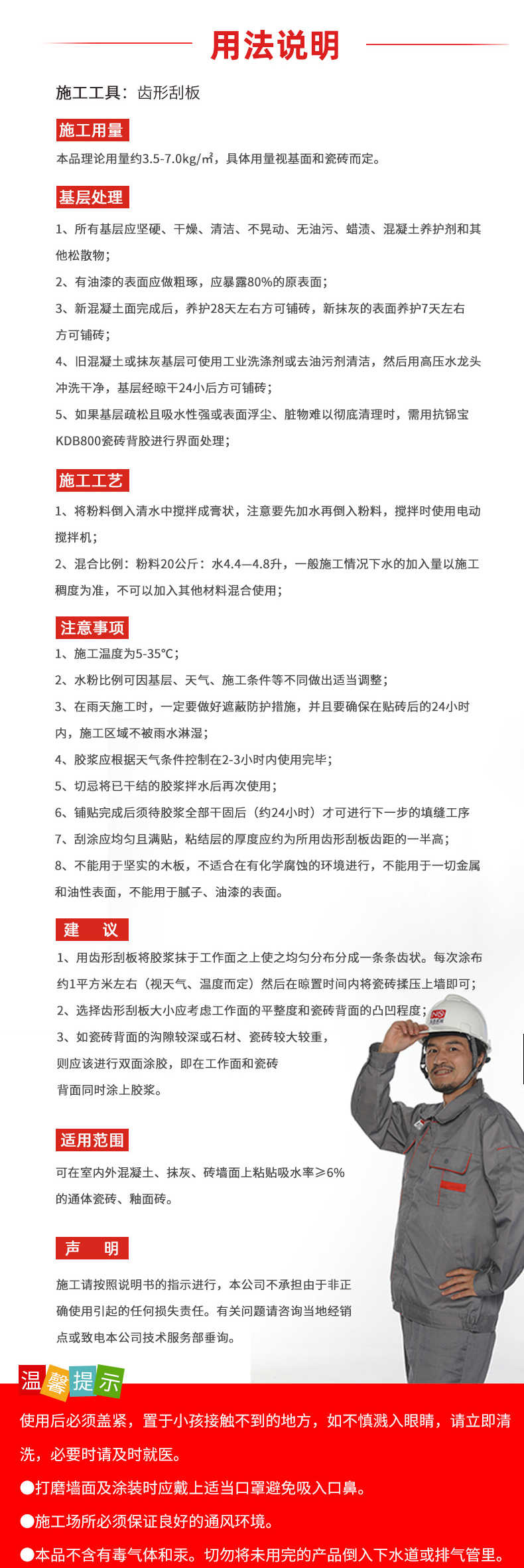 本品理論用量約3.5-7.0kg/㎡,具體用量視基面和瓷磚而定。