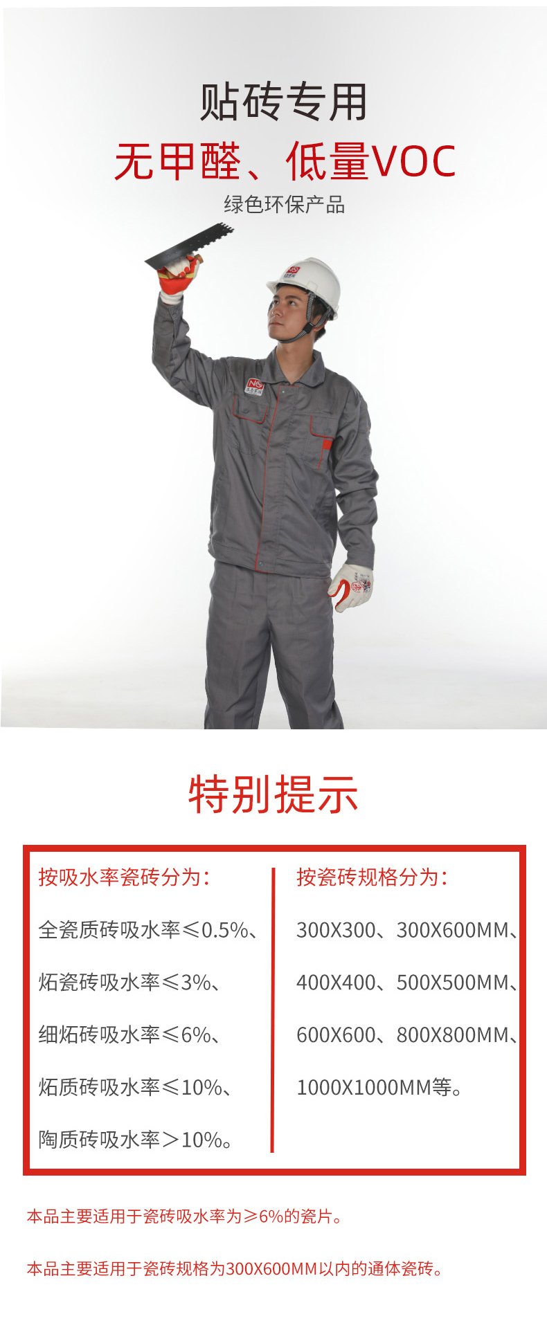 至≥3%的瓷片、微晶石、全瓷系列,而且適用于吸水率為≤6%至≥3%的各種天然石材及低吸水率和大規格人造石材、重型磚的粘貼。