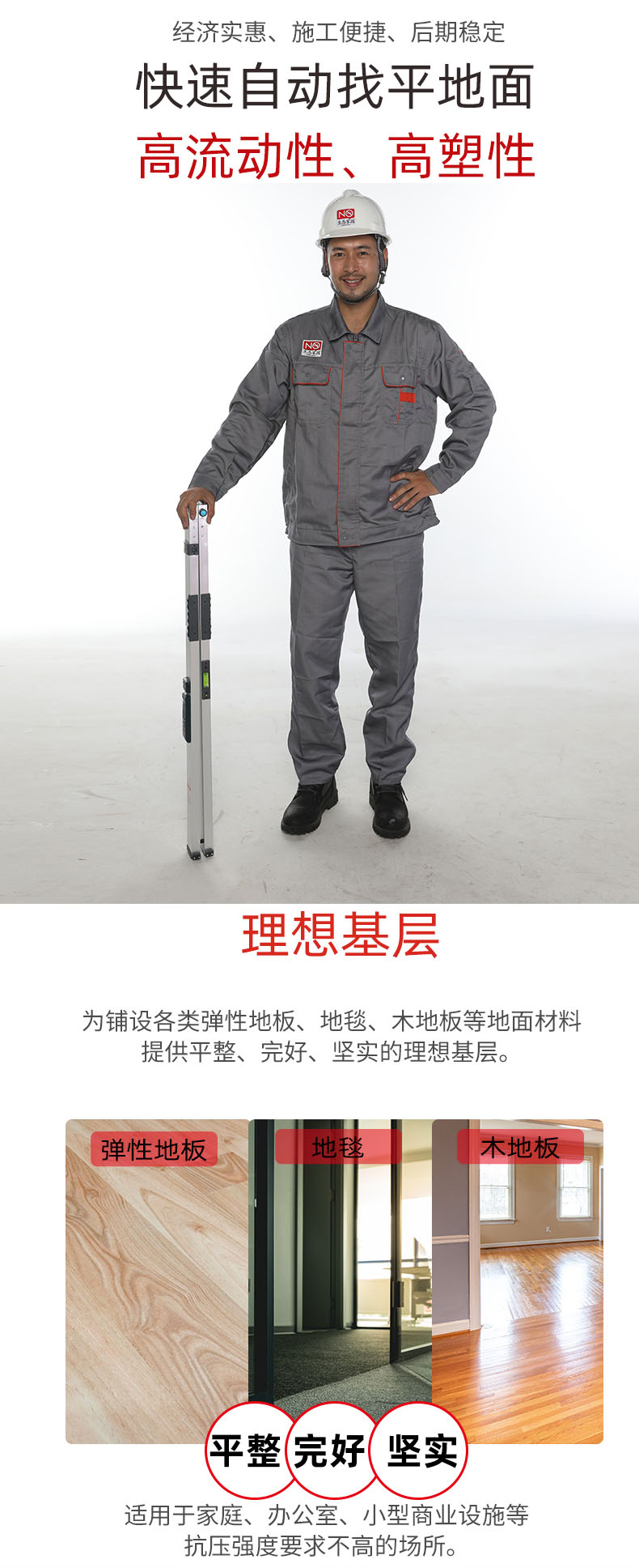 為鋪設(shè)各類彈性地板、地毯、木地板等地面材料提供平整、完好、堅實的理想基層,適用于家庭、辦公室、小型商業(yè)設(shè)施等抗壓強(qiáng)度要求不高的場所。