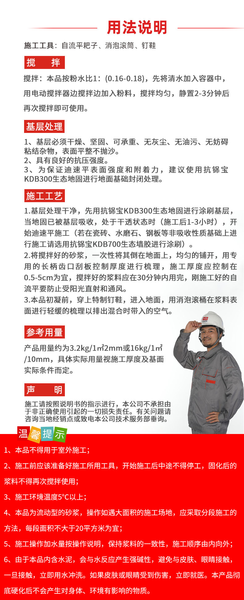 3、為保證迪速平表面強(qiáng)度和附著力,建議使用抗铞寶KDB300生態(tài)地固進(jìn)行地面基礎(chǔ)封閉處理。