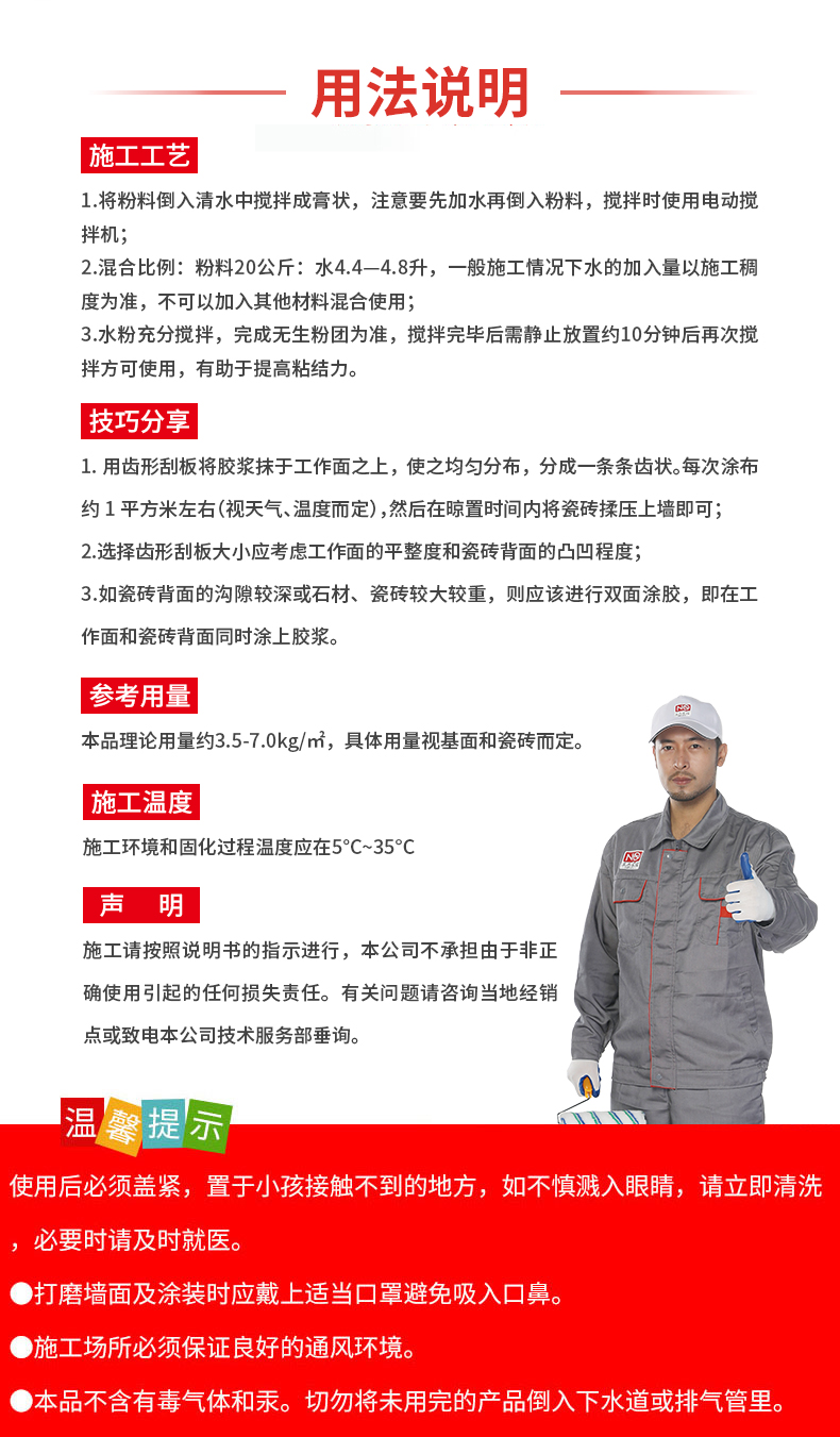 本品理論用量約3.5-7.0kg/㎡,具體用量視基面和瓷磚而定。