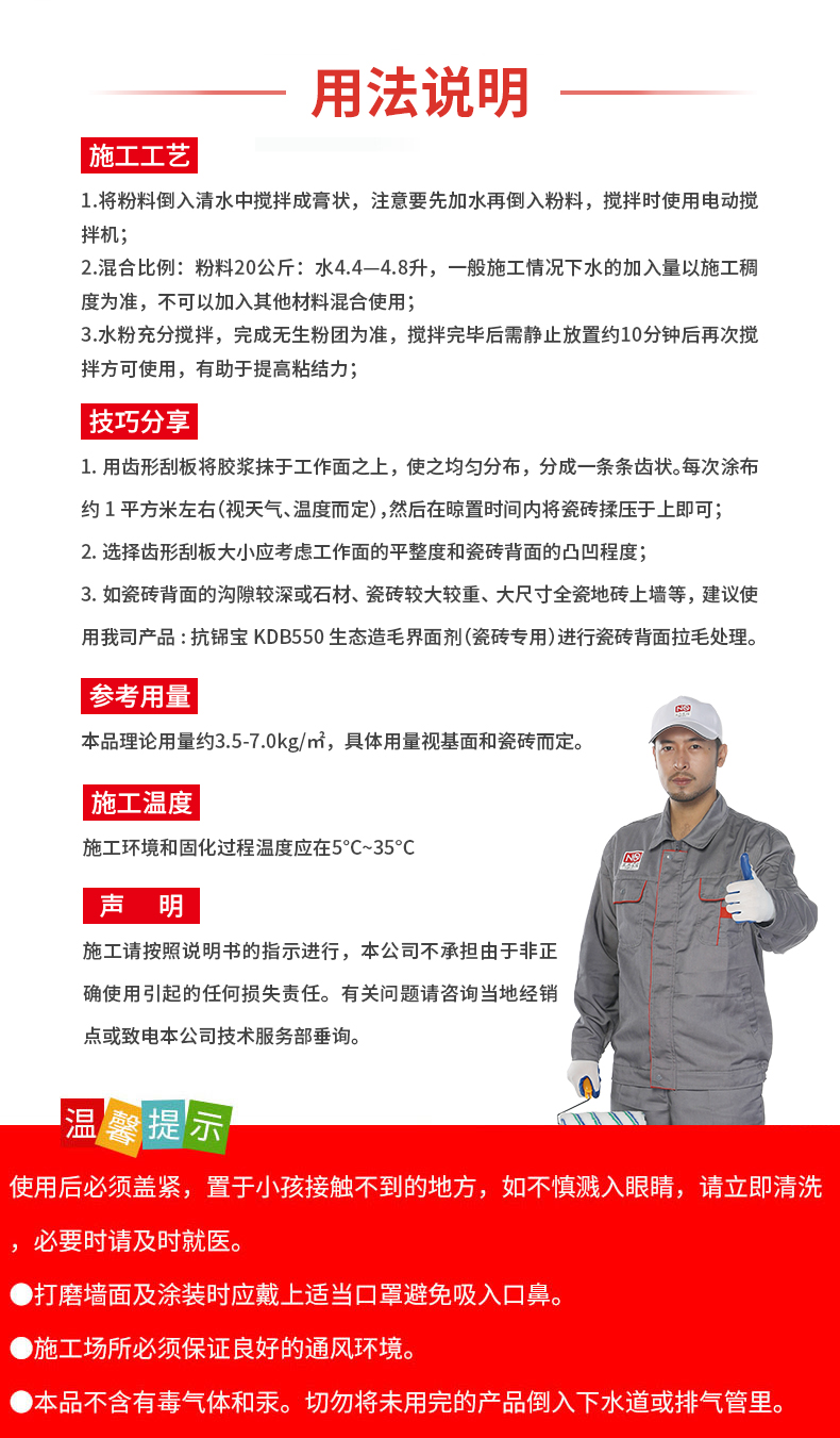 本品理論用量約3.5-7.0/kg/㎡,具體用量視基面和瓷磚而定。