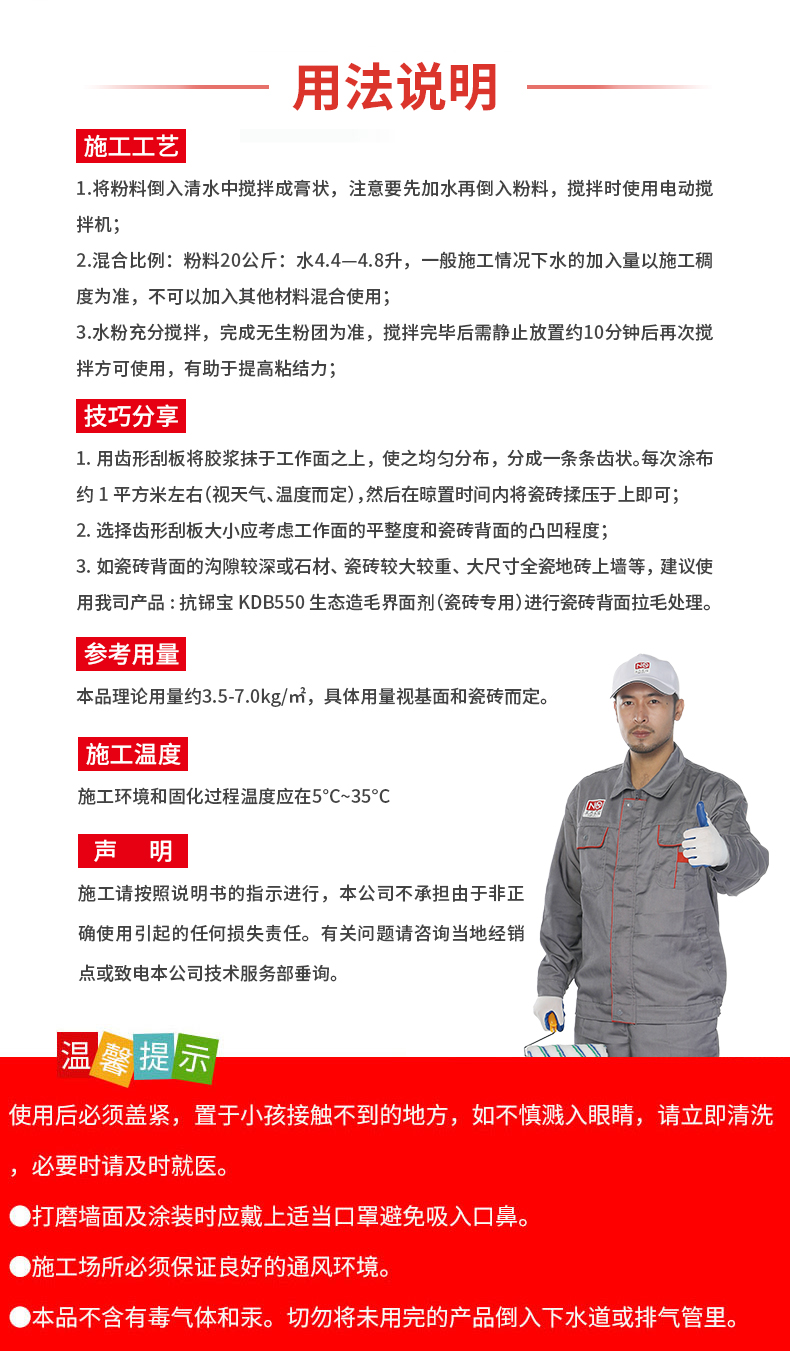 本品理論用量約3.5-7.0/kg/㎡,具體用量視基面和瓷磚而定。