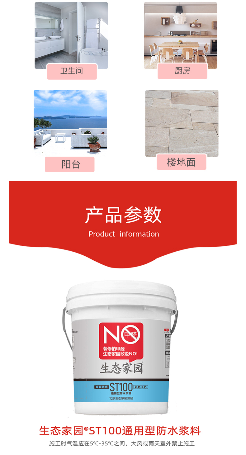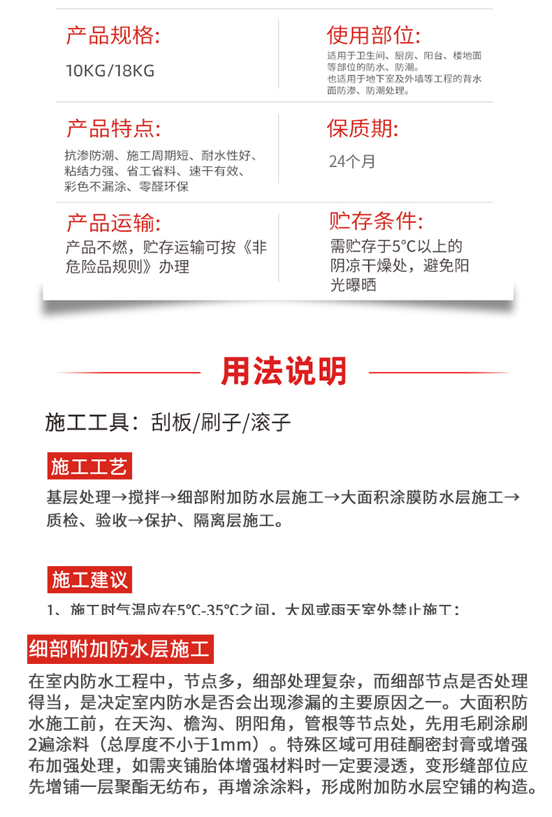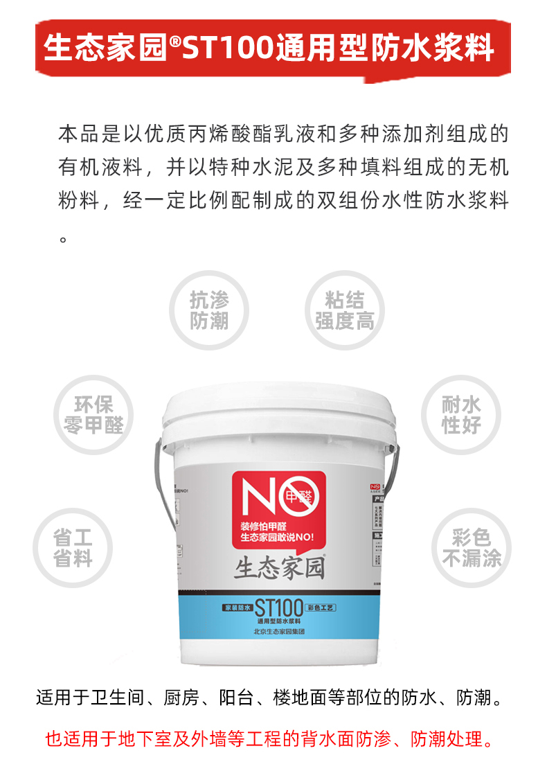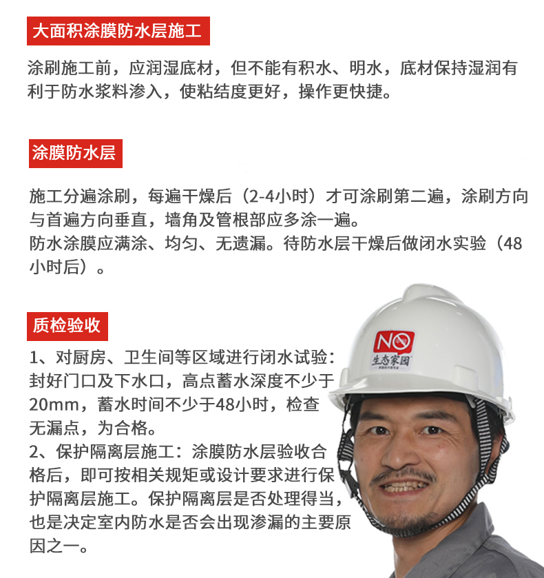 適用于衛生間、廚房、陽臺、樓地面等部位的防水、防潮。也適用于地下室及外墻等工程的背水面防滲、防潮處理。