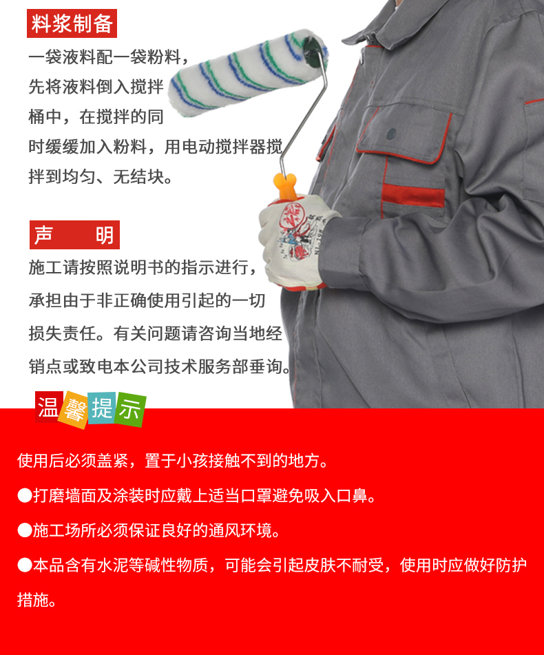一袋液料配一袋粉料,先將液料倒入攪拌桶中,在攪拌的同時緩緩加入粉料,用電動攪拌器攪拌至均勻、無結塊。