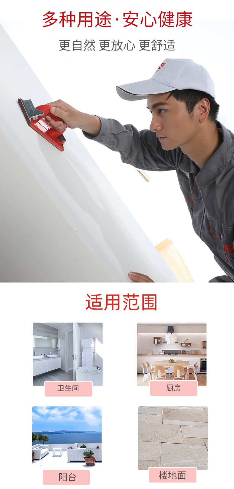適用于衛生間、廚房、陽臺、樓地面的防水、防潮。也適用于地下室及外墻等工程的背水面防滲、防潮處理。