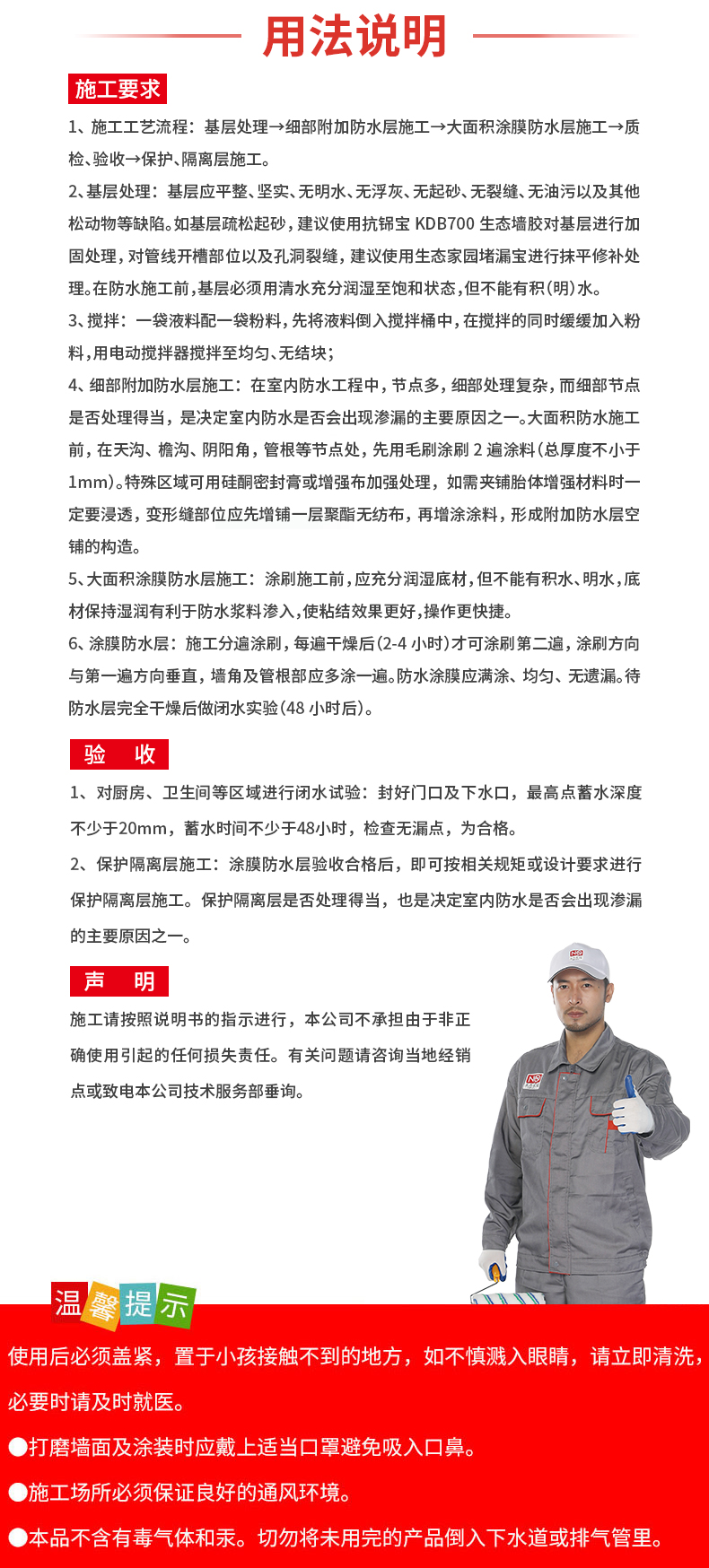 液料:粉料=10:27(重量比);每毫米厚的涂膜漿料使用量約2.0-2.2kg/㎡。實際用量因施工中多種因素影響的不同而不同。