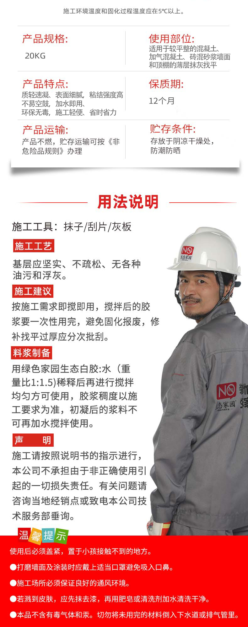 適用于較平整的混凝土、加氣混凝土、磚混砂漿墻面和頂棚的薄層抹灰找平。既具有建筑石膏早強、快硬、質輕、防火等優點,又具有施工和易性好、粘結強度高、不易空鼓和開裂的特點;具有呼吸功能,可調節室內空氣濕度,改善居室環境。