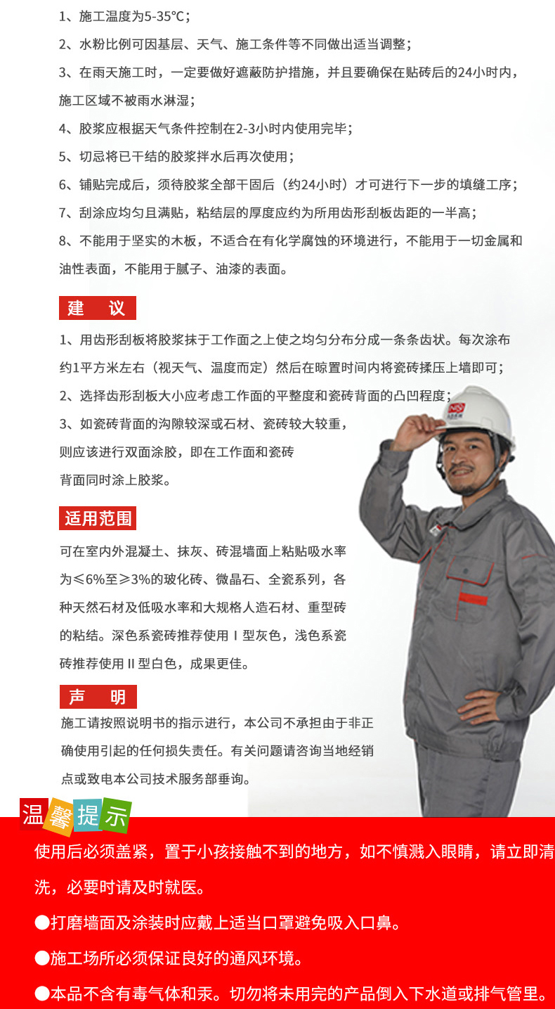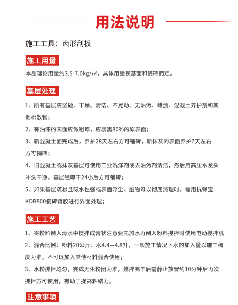 本品理論用量約3.5-7.0/kg/㎡,具體用量視基面和瓷磚而定。
